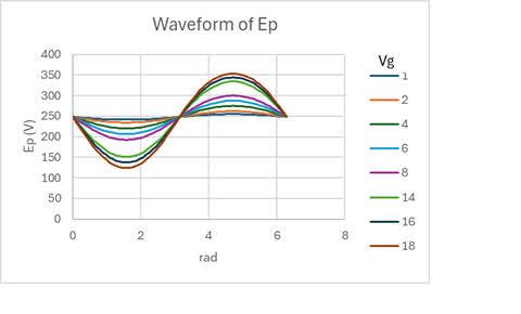 添付図の左上がフィッティング結果です。きれいにフィッティングしています。この式にsin(θ)を代入するのですが、無信号時バイアスを(250V, 40mA)と想定して、sin(θ)-14を代入しました。-14は上記バイアスでのグリッド電圧です。