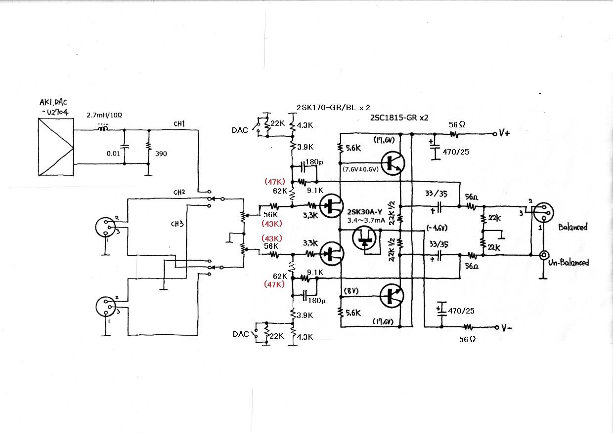 同じような作例ですが、ペルケさんのFET式平衡型差動プリアンプVersion2ではDACと外部入力のゲインのバランスをとるために、入力回路にアッテネーターを入れています。この応用回路では負帰還量をスイッチで切り替えて調整をしました。また抵抗の朱記の所は、ノイズを少なくするために試しに小さな抵抗を使ったものです。問題が無いので、現在そのままにしています。