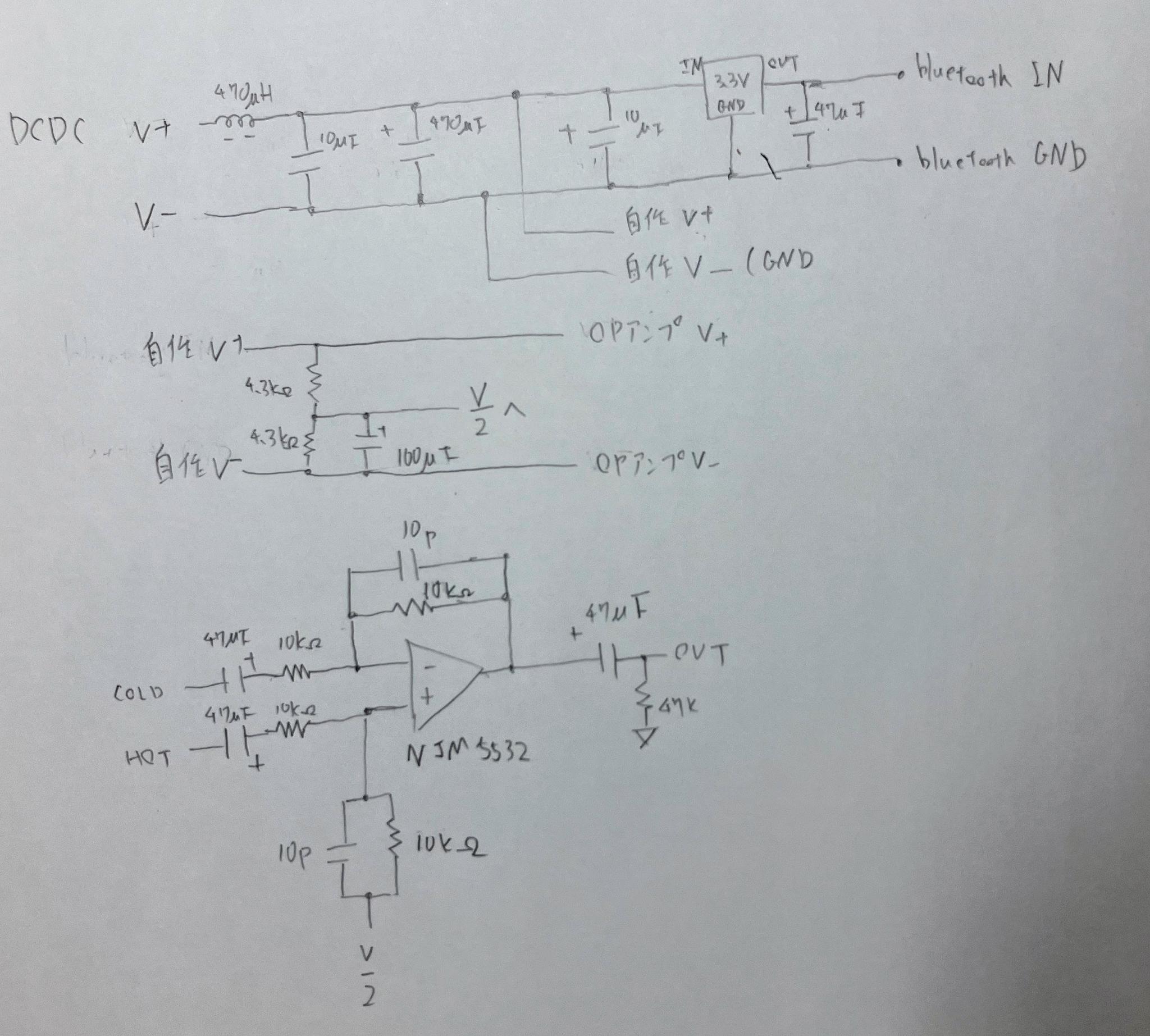 もう一つ気になるのが、「自作した基板」の部分で、幸いにもbluetooth基盤と自作した基板の間はコネクターで接続されているので、③ bluetooth基盤と自作した基板の間の接続を全て外す、④ bluetooth基盤と自作した基板の間の電源線のみ外す、⑤ bluetooth基盤と自作した基板の間の信号線を外す、⑥ bluetooth基盤と自作した基板の間の信号線を片チャンネルだけ外す(接続されている方と外した方で違いがあるかを含め)、⑦ 自作した基板のOPアンプを外すというテストをすることでヒントが得られるかもしれません。