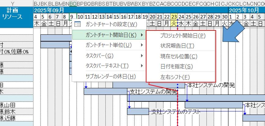 ガントチャートの表示開始日は、デフォルトではプロジェクト開始日となりますが、このガントチャート表示開始日を変更することにより表示可能です。