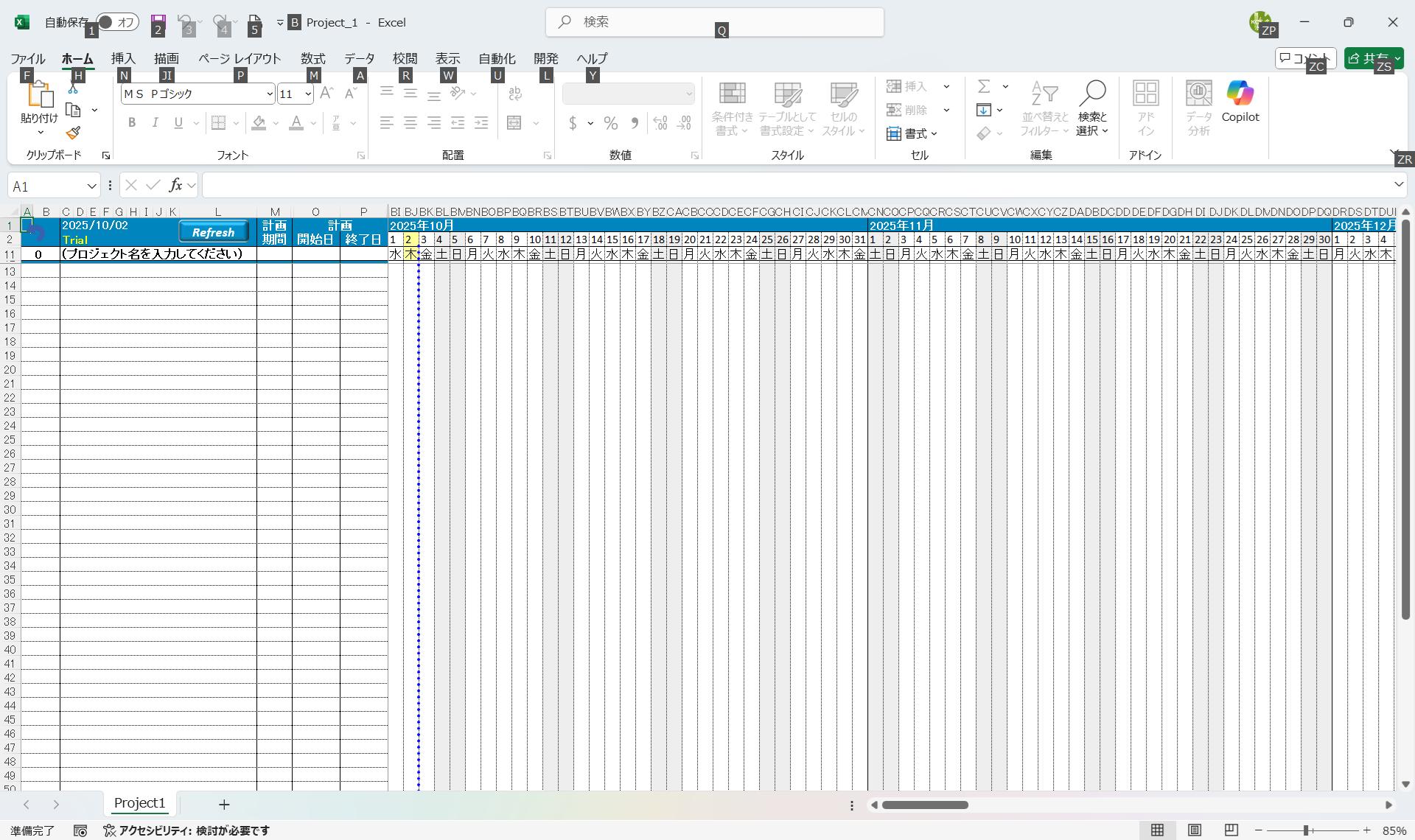 まれにProjectExcellerタブが表示されないことがありますが、Refreshボタンを実行することで再表示されます。