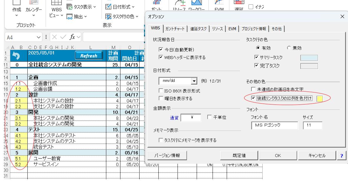 操作:リボンからオプションを選択しオプションダイアログのWBSタブ、「後続リンクタスクのID列を色付け」をONにする。