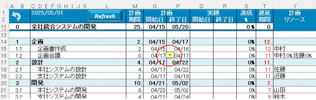 WBSの計画開始日、終了日のセルを選択すると▽ボタンが表示されます。これを押すとカレンダーが表示され、日付を設定できるのですが、なぜかこの▽が薄い黄色(ベージュ色?)になることがあります。