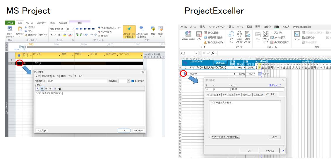 MS Projectからの移行を検討しています。MS Projectではタスクごとにメモを設定することができますが、ProjectExcellerでは同様の機能はありますか。