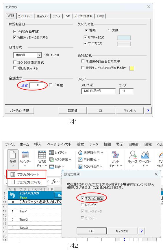 オプションダイアログ(下記の図1)上の設定項目のうち項目名が青文字のものは、プロジェクトファイル毎の設定項目となります。図1の場合、「通貨」がファイル全体に適用されます。