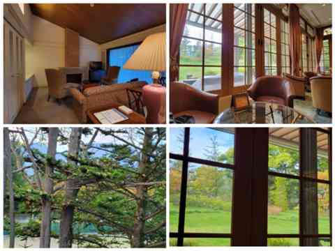 皆さんに続いて、軽井沢本館です。久々に持ち部屋の占有使用です。テニスコートの先に浅間山がはっきり見えています。ラウンジに行ってお気に入りの椅子に座ると、色づいた木々が秋になったと感じさせてくれます。