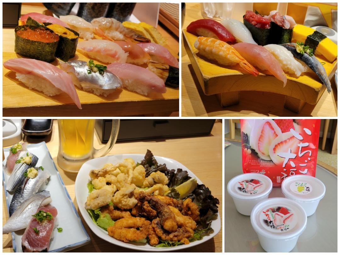 ランチは息子と二人なので、すしの磯丸、平和通り店へ行きました。私は若い頃を思い出してタコとげその唐揚げをあてにビール、〆に光り物です。一方、息子は北海にぎりです。食べ終わってから、おやつにイチゴ大福を買ってホテルに戻りました。