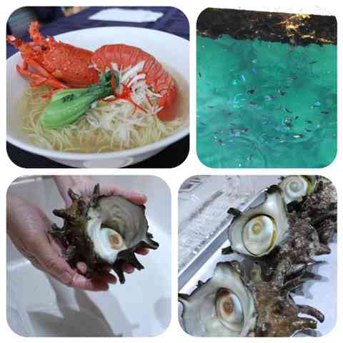 お土産は港の売店。サザエがすごく安く買えます。巨大サザエ3個で1000円ちょっと。他のお土産もあわせてクーポンで支払いました。船を待っている間にカモメ用のかっぱえびせんを海に小さくして撒いたらきれいな青や紫のお魚がたくさん来ました。