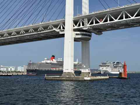 詳しくは後ほど「周辺おすすめコーナー」に書きますが、横浜港初の豪華客船5隻集結で、大黒埠頭に停泊するクィーンエリザベス号とMSCベリッシマ号の洋上スナップです。ベイブリッジの橋脚にはスカイウォーク展望室も見えます。