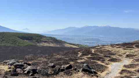 GWの山火事跡が痛々しいですが、富士山から、南・中央・北アルプス、御嶽山、乗鞍岳のパノラマが広がります。