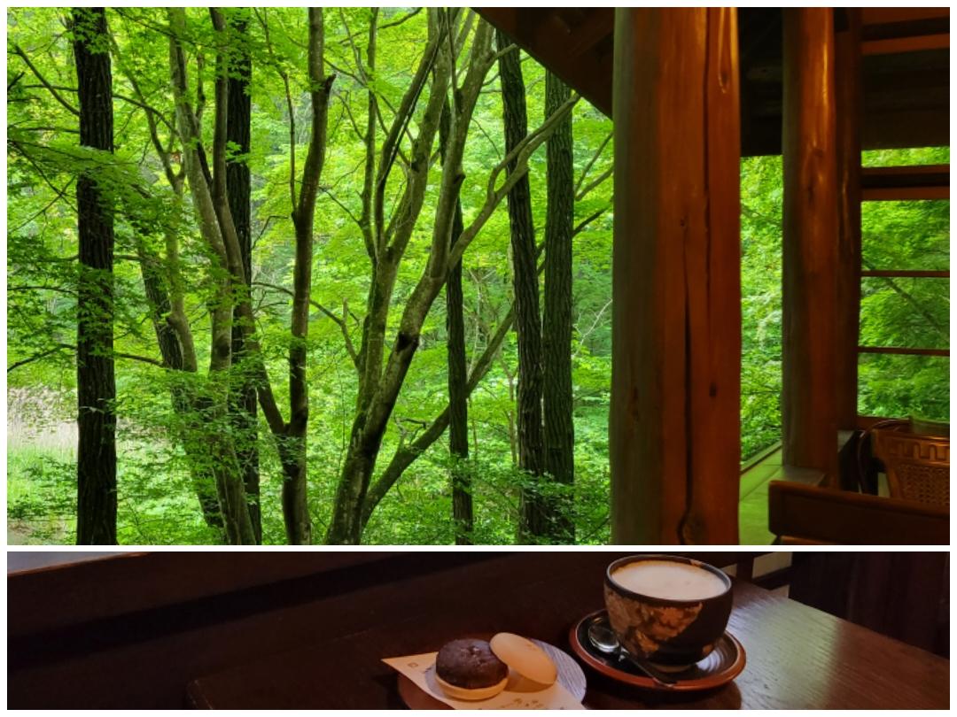 梅雨の季節、ここからの眺めは最高です。カフェオレ600円、最中