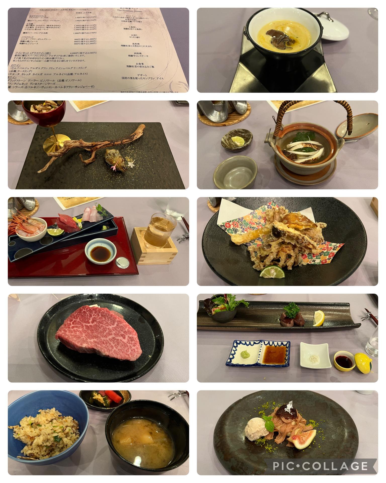 > ディナーは秋の味覚フェアでこれでもかと言うくらい松茸が使われており、飛騨牛のステーキも余計な脂分がなく大変美味しかったです。地元産の栗を使ったモンブランのデザートもとても美味しく頂きました。