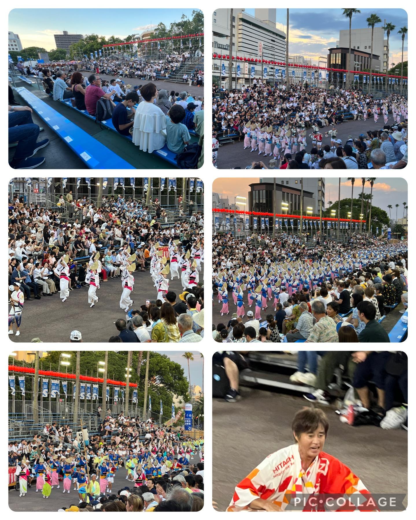 台風の影響で神戸に一旦着いて帰宅のため降りたい人を下ろした後出航して徳島港に着岸し専用バスで藍場浜演舞場の桟敷席で観覧しました。