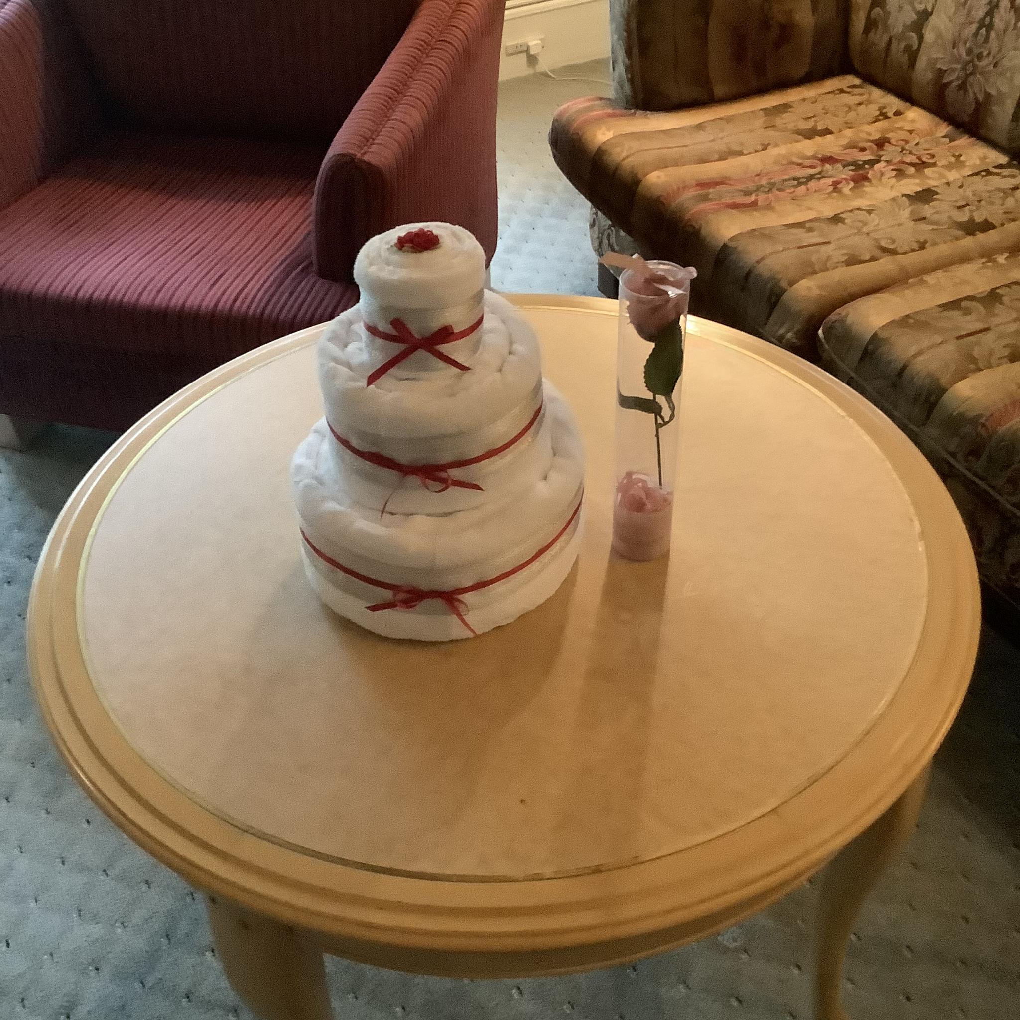 お部屋にサプライズのタオルケーキとお花、さすがホームですね(*^-^*)