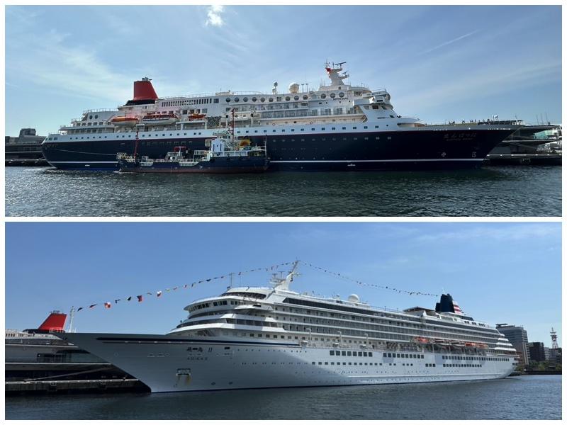 写真左(上)大桟橋に並ぶ日本が誇るクルーズ船。右が飛鳥Ⅱで左がにっぽん丸。