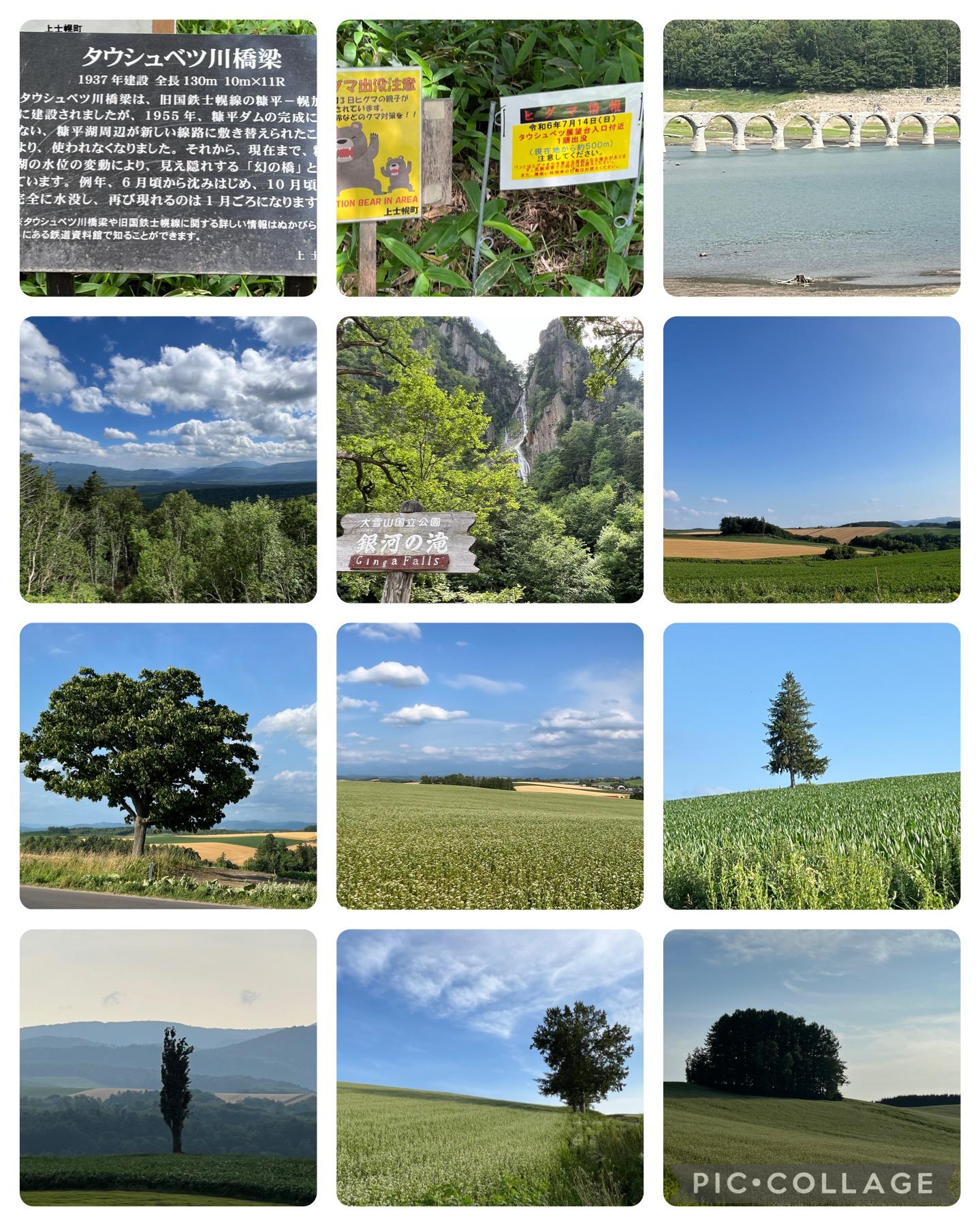 然別湖では廃線になった士幌線の湖底に沈んだ幻の橋タウシュベツ橋梁跡が見れて道内国道最高地点の三国峠からの雄大な原生林に感動して層雲峡では銀河の滝を見てから美瑛のパッチワークの道で好天に恵まれ絵葉書のような素晴らしい景色を堪能しました。