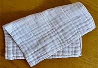 蚊帳のフェイスタオルは、8枚重ねの台拭きにたいして、4枚重ねの半分の薄さ。泡立ちよく、ふわりとした肌触りよく、乾きもよく理想的なお風呂タオルかもしれません。