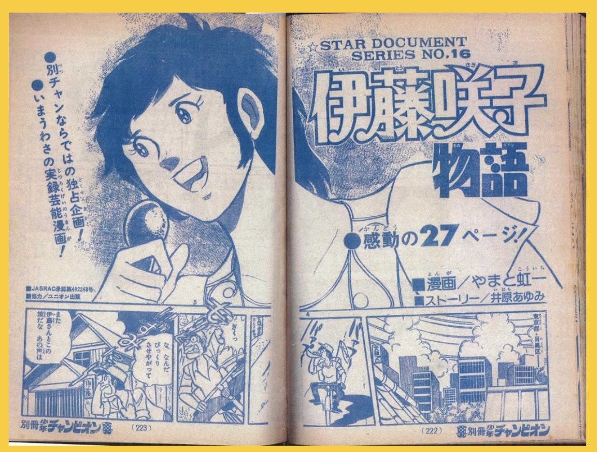 「伊藤咲子物語」は1974年9月号の別冊少年チャンピオンに掲載されました。1973年からスタードキュメントシリーズが始まり、シリーズではサッコちゃんは16作品目になります。初回はアグネス・チャンさんだそうです。