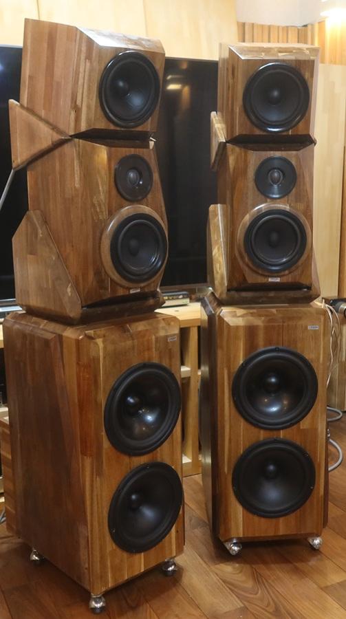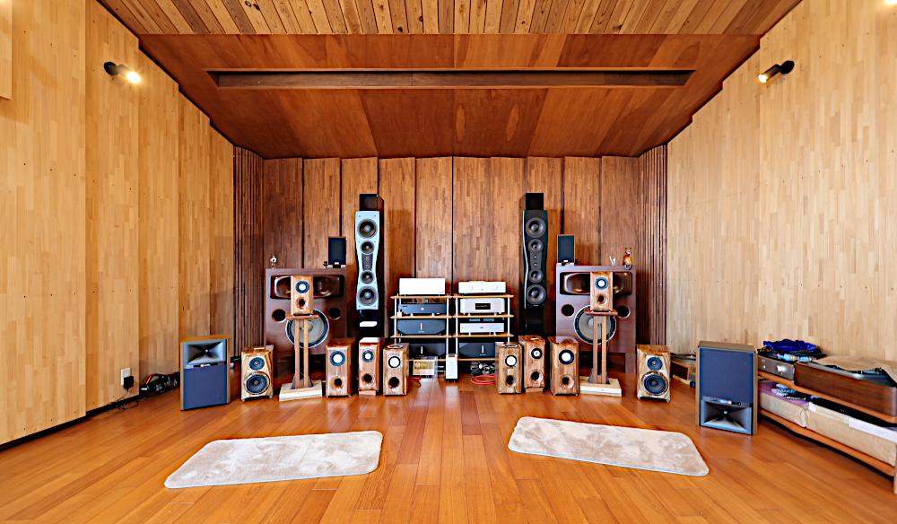 石田さんのフラグシップスピーカーの写真です。3段の真ん中のシステムが今回の視聴会で皆さんが感銘したサブウーファなしバージョンです。