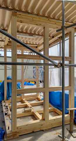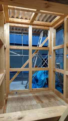 その屋根の下に測定ルームを組み立てます。とりあえず壁なしオープンで着工します。