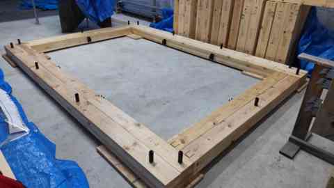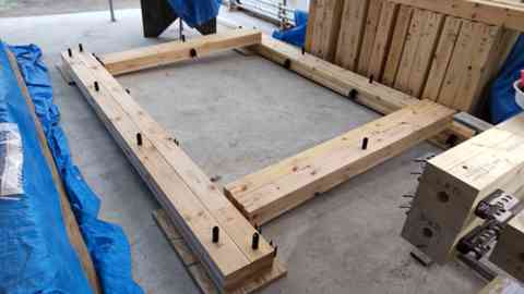 測定が終わったら解体する部屋なのでアンカーボルト無しで土間に置くだけ。土台の下に敷く96kgの高密度グラスウールも準備はしたが省略とした。