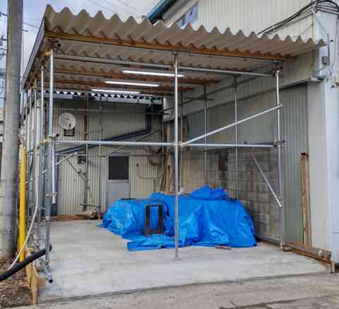 手間の原因は単管で、躯体が丸管なので何をするにも寸法の基準点が曖昧で、屋根の折板を付けるのが至難の業でした。