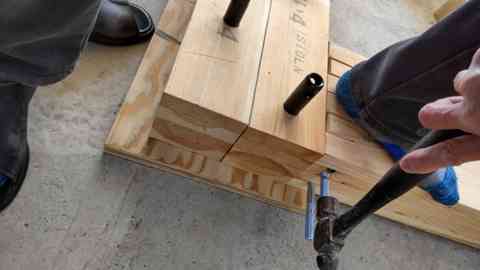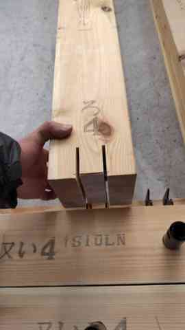 組み立てはとても簡単で、柱と梁などの交点にトンカチでドリフトピンを打ち込めばガッチリとした躯体が組みあがります。