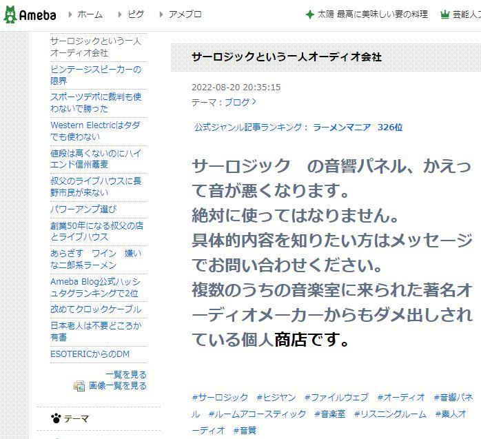 うちの音楽室の音が何故良いのか? サーロジックの製品で出来上がった部屋だからでしょ。お前がいじくりまわして相当クズになった筈だがそれでもお客様が喜んでいる、けったいですね?
