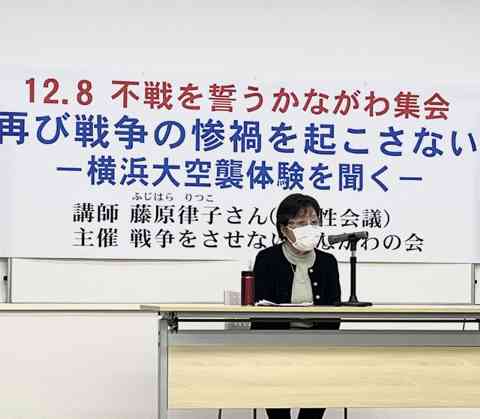 講演者は当時14歳だった藤原律子さん。29日元町にあった女学校に登校すると間もなく空襲警報が鳴り、急いで帰宅する事になった。交通機関は全て止まり、歩いて浅間町の叔母の家に向かった。空は大きな黒い雲のようなものに覆われ轟音と地響きが起こり、防空壕に一時避難したが周りに火の手が上がり、蒸し焼きにされると叫ぶ声に飛び出した。叔母とは会えず、防空頭巾を被り救急用品を入れたカバンをさげて線路に沿って妙蓮寺近くの自宅へ向かった。途中で同じ防空壕にいた男の子が爆撃で膝から下を飛ばされるのを目撃したが、逃げることを優先していた。しばらく歩いて浅間神社の軒下に潜り込み、持っていた救急用品で傷ついた足の手当てをすると疲れのため寝込んでしまった。目が覚めて外へ出ると、神社の高台からは一面焼け野原となった光景が目に飛び込んだ。ようやく戦火を逃れた家に辿り着くと意識を失い、翌朝母親に起こされ、背中をさする手の感触に涙が止まらなかった。
