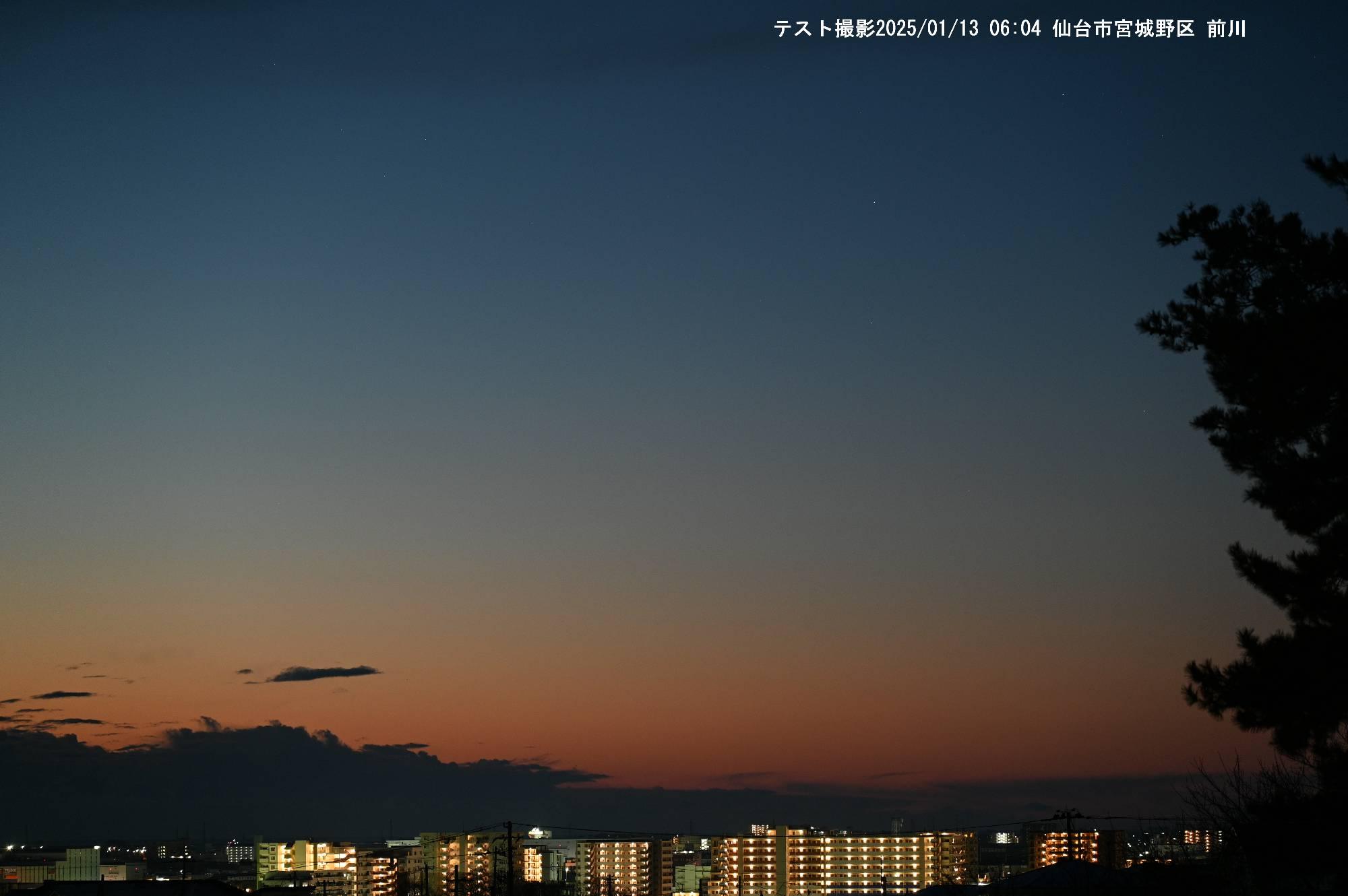 残念ながら東の水平線には高さ3~5度まで黒い雲が広がっており、マイナス等級になっている?彗星は肉眼でも、双眼鏡でも確認できませんでした。朝焼けのテスト撮影と確認のための画像をご覧ください。