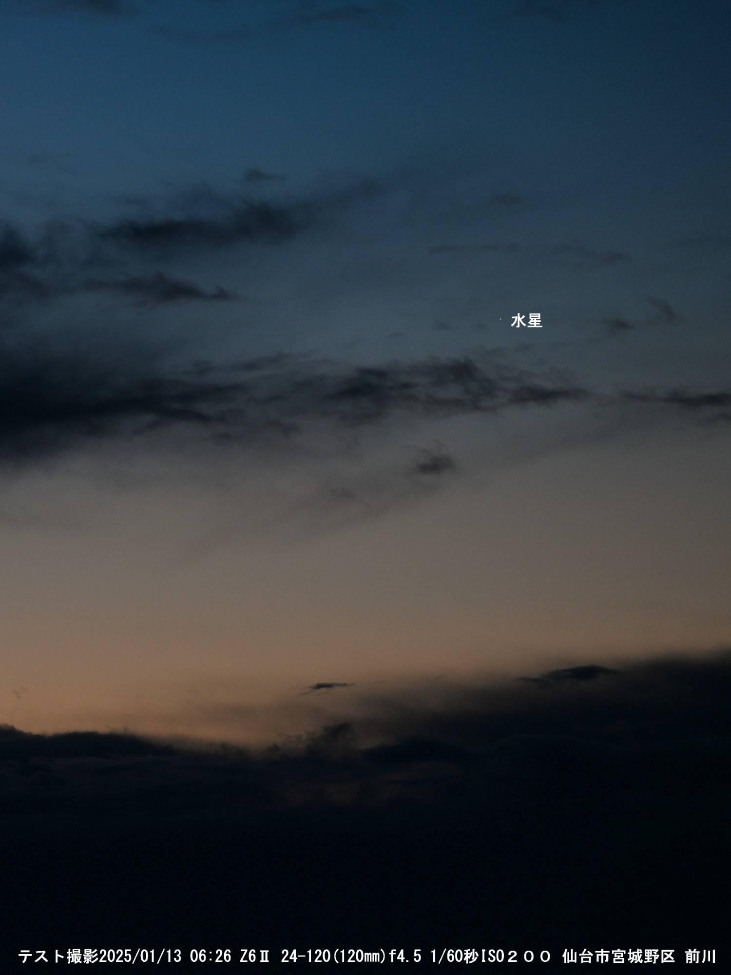 6時を過ぎて水星が昇りました。しかし、薄明も終わり、水平線の雲も邪魔して水星の左下あたりに在るのになーと残念至極で帰宅しました。