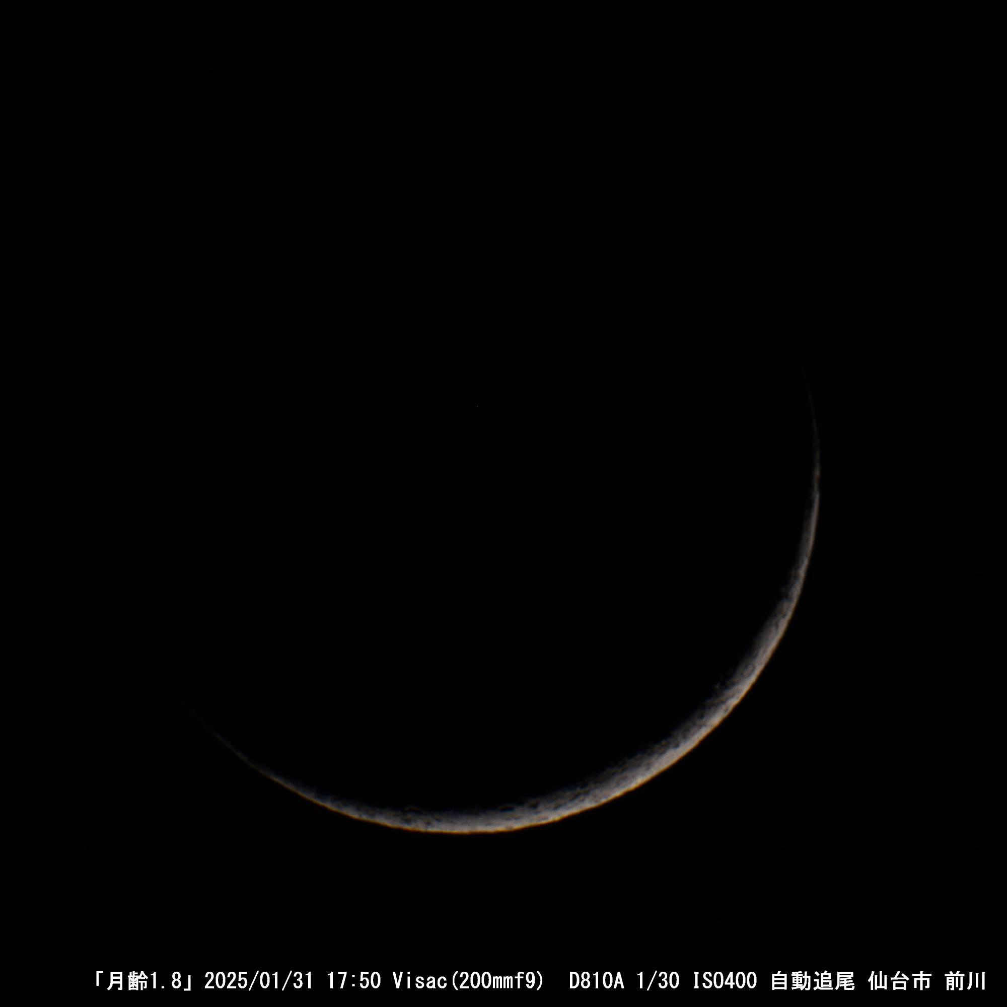 2025/01/31 夕方地平線まで快晴の空、明日の土星食のテスト撮影をしました。月齢1.8の月です。地球照がはっきり見えました。