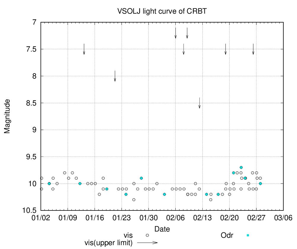 昨年来話題にしているかんむり座Tですが、そろそろと言われながらまだ爆発しておりません。2025年になってからの眼視光度の光度曲線をVSOLJのサイトで作成してみました。まだ10等前後をうろうろ状態です。ただ、スペクトルを観測している外国の方のレポートでは、水素の輝線に変動が見られて居るようです。主星から流れ込むガスが形成する伴星(白色矮星)の周囲の降着円盤が高温になって来て居るとの話も。さて、どうなるでしょうか?