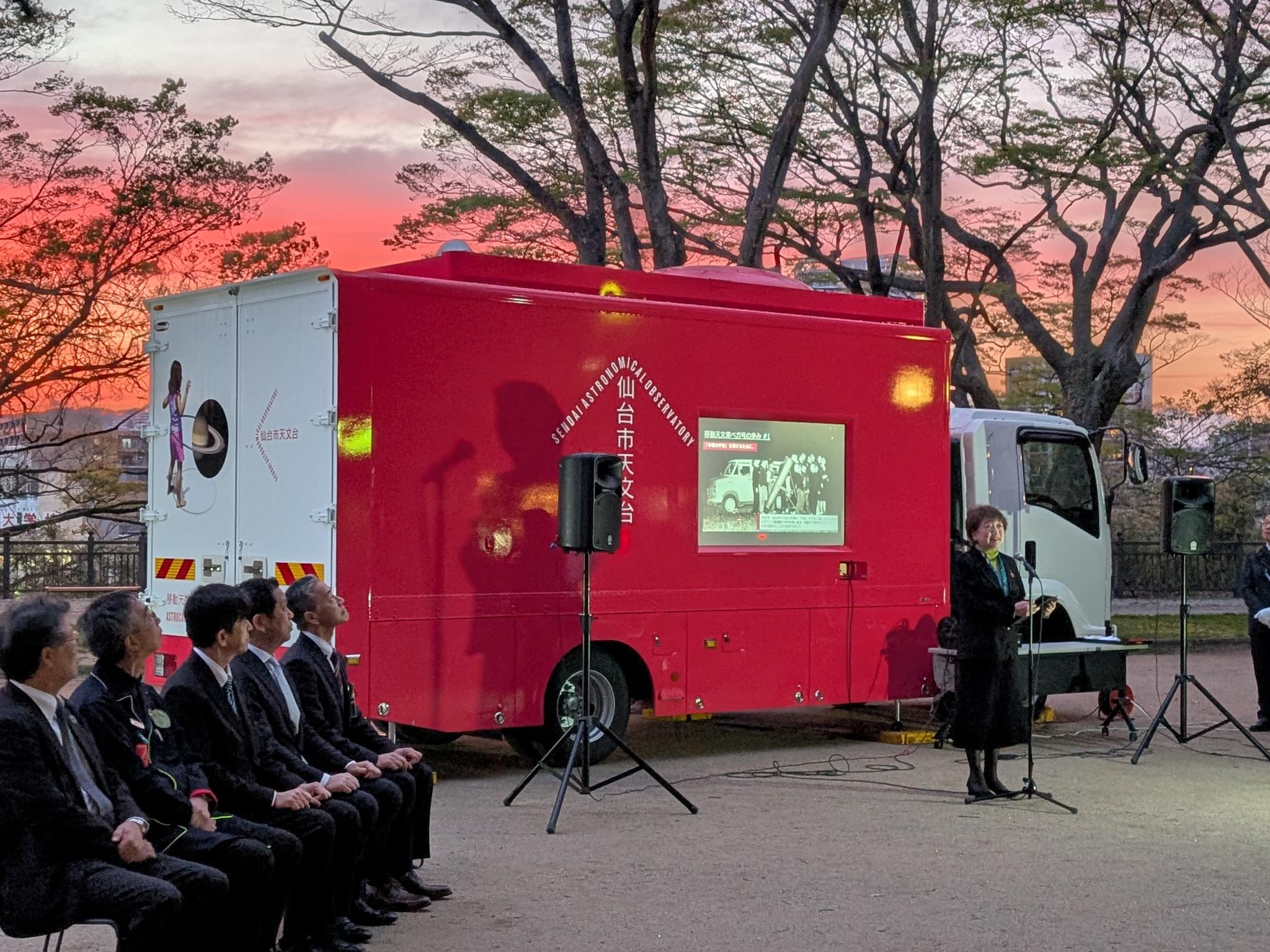 仙台市天文台の移動天文車「ベガ号」の新車両をお披露目会が昨日行われましたので行ってきました。新車両はデザインが一新され天文台のイメージカラーの赤色です(消防車カラーではないです)。お客様が望遠鏡周りに多く集まれるように後ろから乗車できるようになったり、トラックの脇の液晶プロジェクターが大画面化していたり、電子観望機材(VESPERA)が積まれていたりします。これまでアイコン的だったドームがなくなったのは寂しい気はしますがスライディングルーフ式なので視界が開けて望遠鏡わきからも夜空が楽しめそうです。ベガ号の出動情報を載せますので皆さん見に来てください。自分は5月30日に参加予定です。