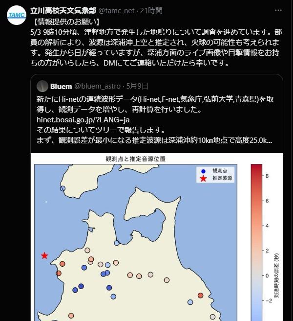 青森で5月3日 9:10に地鳴り音が観測されたようですが火球の衝撃波の可能性もあるそうです。宮城からのATOM CAMには写らない距離のような気がしますが北を写しているようであれば要チェックです。