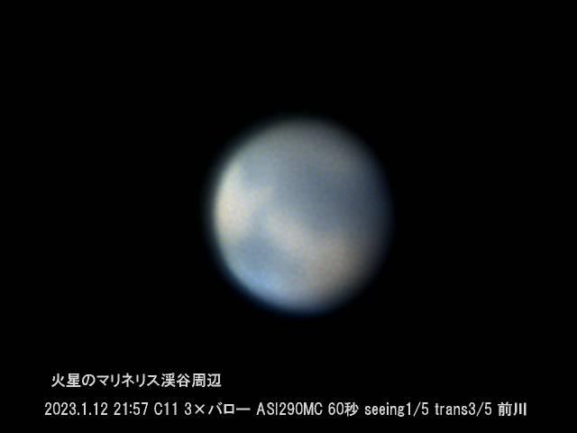 2023年1月12日の火星です。気流の流れが速く,ピントの山がつかめない状態でしたが,最近では良い方だったので撮影してみました。昨年12月1日に接近(直径約17秒台)しましたが,もう遠ざかりつつあり現在は(直径約15秒台)になりこれからますます小さくなります。中央付近にマリネリス渓谷,下方にある白っぽいところが北極冠です。ぼけた画像ですが,これで精一杯の方法で表面の模様を出しました。マリネリス渓谷は東西約4千㎞の長さの峡谷で,地球の峡谷とはスケールが違います。