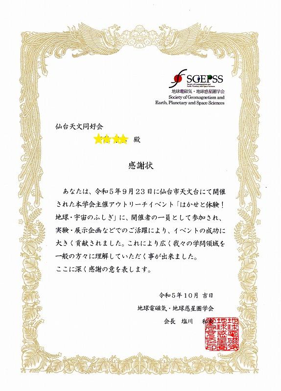 地球電磁気・地球惑星圏学会より感謝状