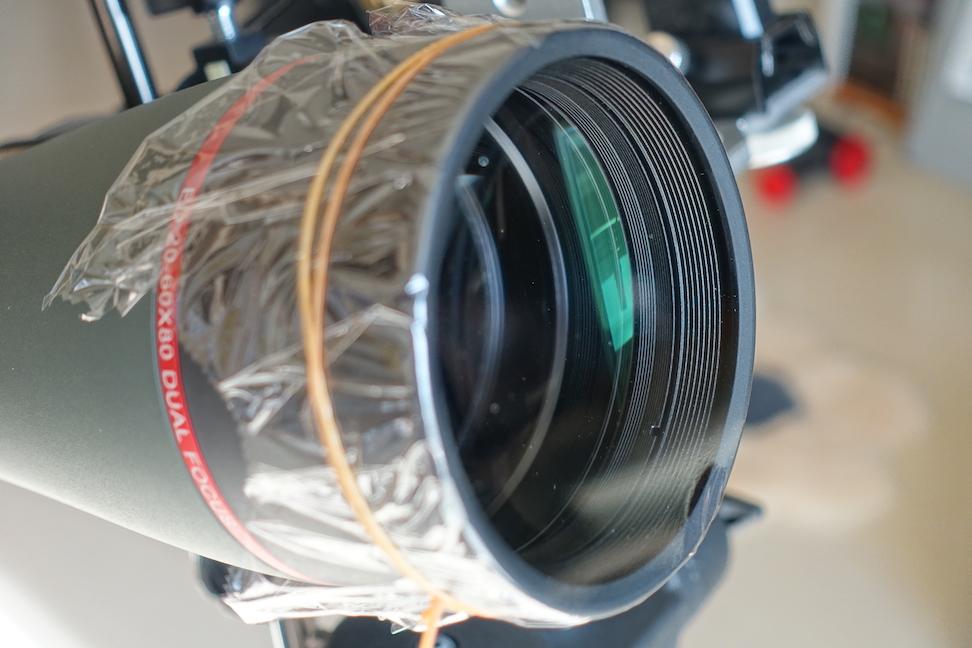 ラップの厚みは0.01mm、つまり10ミクロンらしいので、像への影響はかなり少ないのではと思います。もちろん、200倍以上の高倍率だったり、高性能アポ屈折などの場合には違いが出るのかと思いますが、100倍程度の倍率で観望会などで月や惑星などと見せる時には悪影響はないのではないでしょうか?突然の雨や雪に対しての保護として、○○ラップは十分使えると感じます。どなたか、もっとちゃんとテストしてみませんか?簡単で安価なレンズ保護フィルターとして実用性がありそうです。