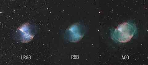 ②真ん中の画像は光害影響の大きいGの代わりにBを使用してカラー合成しました。本来のM27の色合いに近くなるようです。