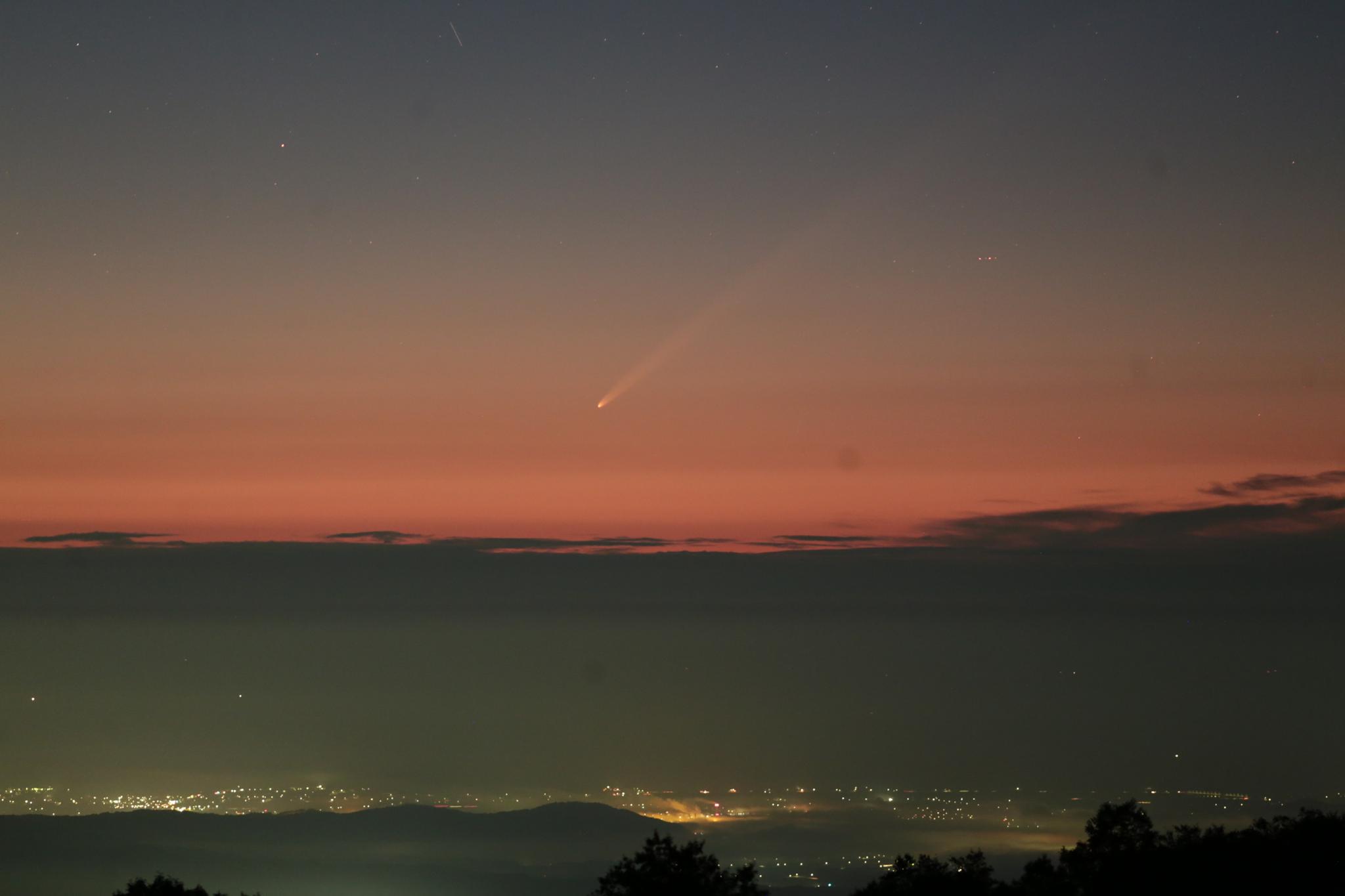 月齢28.7の月が昇り、それを追いかけるように彗星の尾がうっすらと見えてきました。まだ3等級程度の全光度なので肉眼ではかなり厳しいですが、今日はすっきりと地平線の上3度あたりから晴れていたおかげで、肉眼でぎりぎり見える程度でしたが、何とか存在を確認できました。街中では難しいでしょう。海岸の方でも撮影をしていた仲間がいましたが、そちらでもきれいに見えたようです。