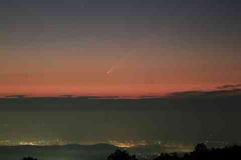 月齢28.7の月が昇り、それを追いかけるように彗星の尾がうっすらと見えてきました。まだ3等級程度の全光度なので肉眼ではかなり厳しいですが、今日はすっきりと地平線の上3度あたりから晴れていたおかげで、肉眼でぎりぎり見える程度でしたが、何とか存在を確認できました。街中では難しいでしょう。海岸の方でも撮影をしていた仲間がいましたが、そちらでもきれいに見えたようです。