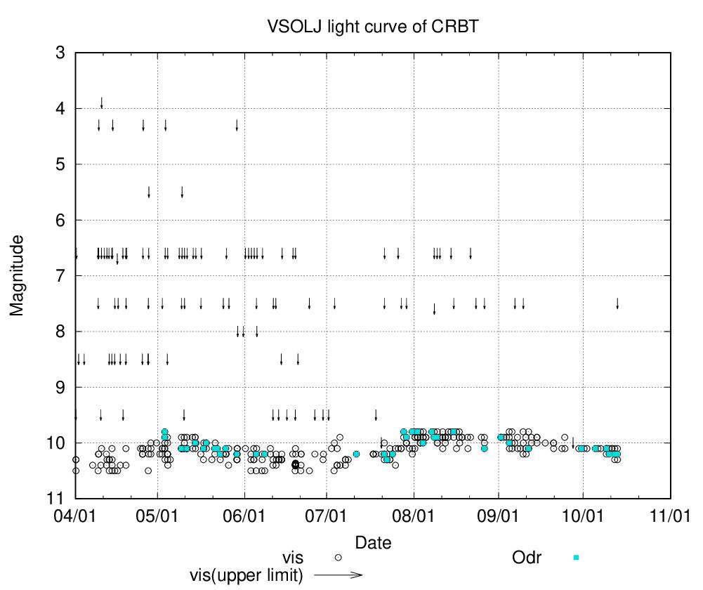 9月から10月のかんむり座Tですが、相変わらず爆発せず。最近の光度曲線(VSOLJで作成、青丸が私の観測)を掲載しましたが、最近は徐々に減光傾向にあるようです。これ以上暗くなると、8cmでは厳しくなる可能性が高いのですが、なんとか10月中は今の観測場所で観測可能でしょう。その後は太陽の向こう側になるので、次の観測時期は12月以降の早朝から深夜、東の空での観測になります。ただ、問題は早朝午前6時頃から深夜という寒い時間帯の観測になってしまう事。体調の面で連日の観測は不可能でしょうから、無理をしない範囲での観測になりそうです。