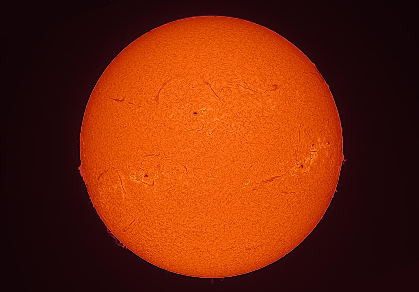 おのでらさんの写真から3日経ちましたが今日の天気があまりにも良かったので昼休みにHα光で撮影してみました。右側の部分がおのでらさんが撮影した大きな黒点部です。太陽面の端のほうまで行ってしまったのでフレアが発生しても低緯度オーロラになる可能性は少ないかもしれません。20日後ごろに成長して太陽正面にもどって来たら低緯度オーロラのチャンスですね。