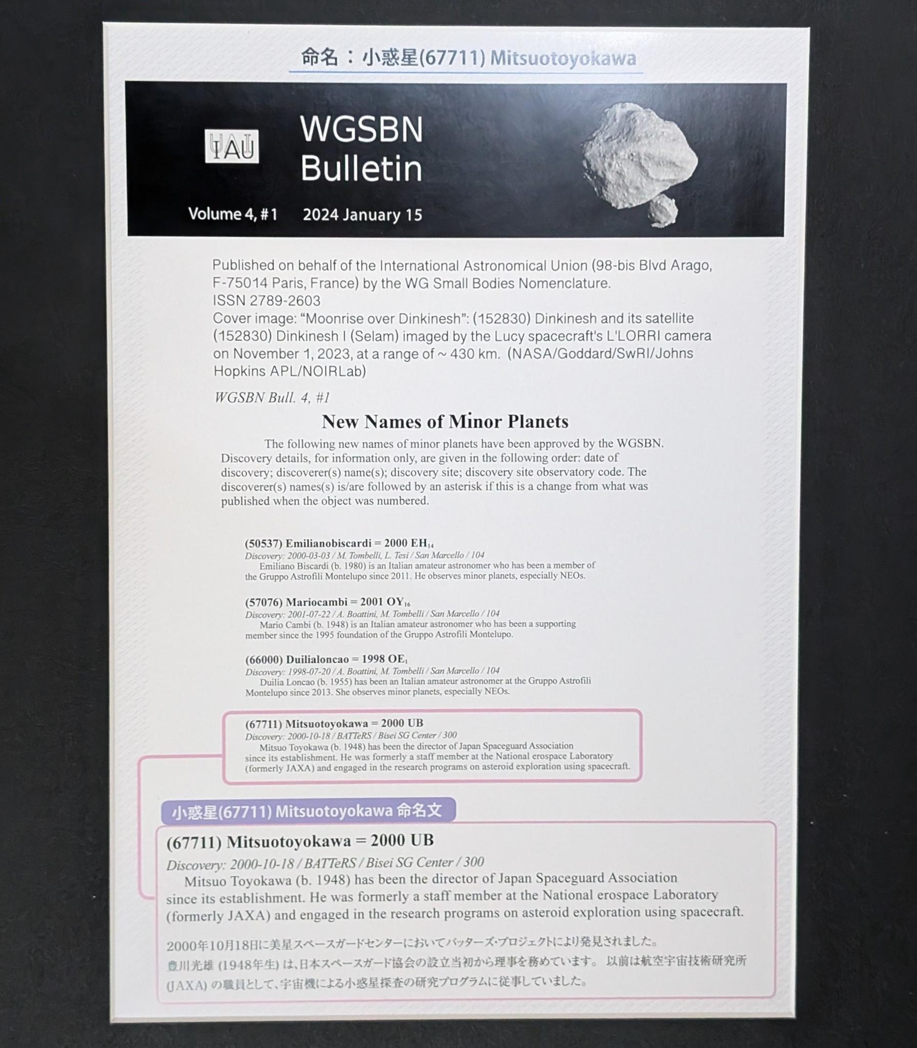 小惑星「Mitsuotoyokawa」の命名おめでとうございます。