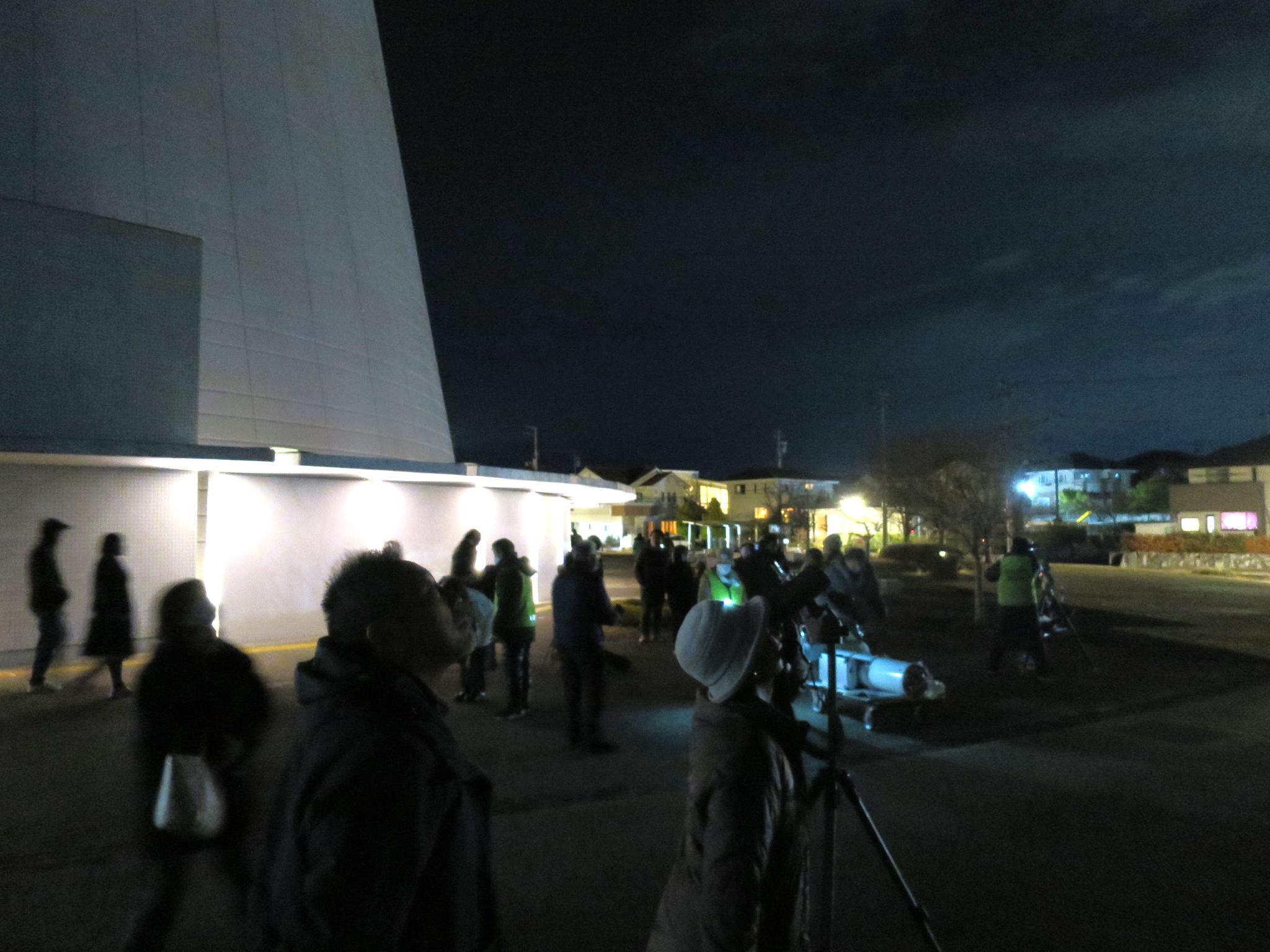 本日、曇りベースながらも、仙台市天文台の玄関先で観望会を実施できました。悪天候で続けて中止になっていたので久しぶりにみなさまと星空を楽しめました。会員7名で、およそ90名のお客様に望遠鏡を覗いていただきました。25㎝反射赤道儀、12.5㎝屈折赤道儀を筆頭に、6㎝屈折経緯台、5㎝双眼鏡などで、木星とガリレオ衛星、土星、火星、すばる、オリオン大星雲などをご覧いただきました。冬の割にはシーイングが良く、土星の環も木星の縞模様もくっきり見え、トラペジウムも美しく分離していました。気温は5℃から3℃に下がり防寒着が必須でしたね。みなさまお疲れ様でした。次回は来年1月25日(土)18:00~20:30の予定です(悪天候の場合は中止です)。晴れますように!