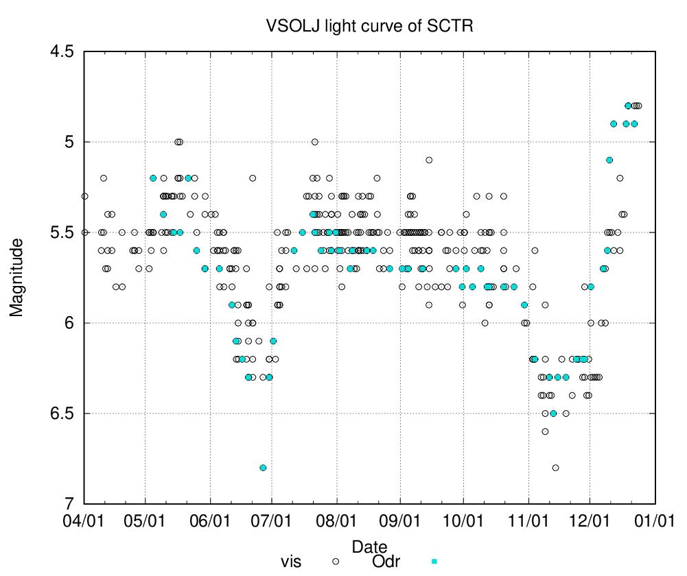 今年のたて座Rの光度曲線です。いつも通り、VSOLJのLight Curve Generatorで作成。青丸が私の目測です。今年は5月に入ってから観測を初めて、今月の22日が最後の観測。今月に入ってから急激に明るくなり、4.8等付近まで明るくなりました。まだ今月は残っているのですが、夕方西空の低空になり日本海側の雪雲に妨げられるので、一応22日を最後としました。はっきりとしたフタコブラクダ型の光度曲線にはなっていませんが、6月末頃と11月中旬に主極小となった感じです。11月の極小と比べると、一ヶ月ほどで3等級ほど明るくなっているのがわかりますね。あれよあれよと言う間に明るくなりました。