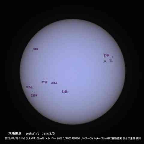 撮影データ:2023/07/02 11:53 鏡筒 BLANCA102㎜f7 ×2バロー ニコンZ6Ⅱ 1/4000 ISO100 VixenGP2赤道儀自動追尾ソーラーフィルター