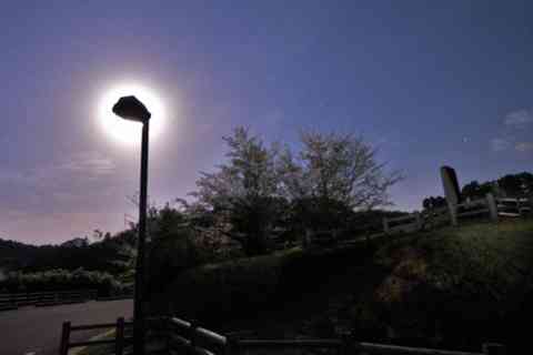 「さそり座から桜を照らす街灯月」 この日は,2時過ぎから雲が切れてきて,姿を見せた星座と桜を撮影していきました。街灯(月)の灯りのすぐ下にさそり座が構えています。明るい月に負けずに,星空も撮影できる露出を探しながらの撮影でした。