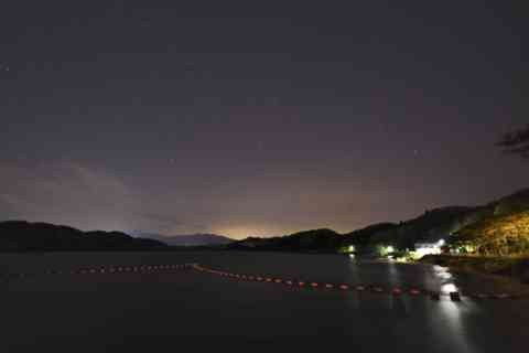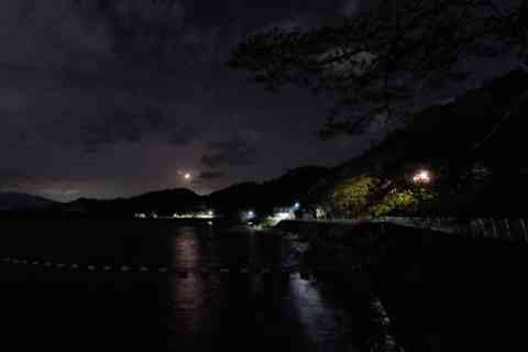 画面中央の2つの点が月と金星です。拡大してご覧下さい。湖畔のフェンスが県道286号線を走る車のライトに照らされていました。月は地球照も見えています。