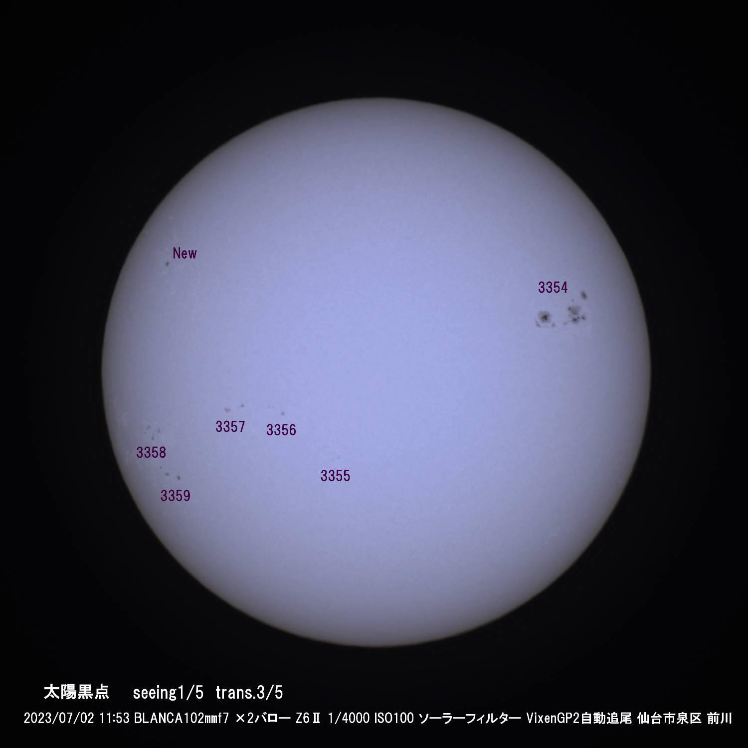 撮影データ:2023/07/02 11:53 鏡筒 BLANCA102㎜f7 ×2バロー ニコンZ6Ⅱ 1/4000 ISO100 VixenGP2赤道儀自動追尾ソーラーフィルター